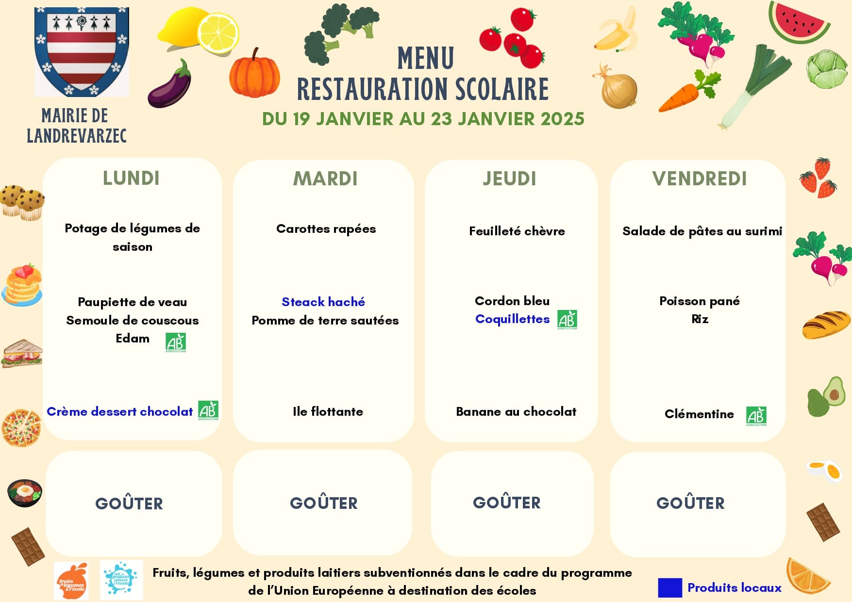 Le restaurant scolaire travaille déjà avec de nombreux producteurs locaux et s’efforce de respecter au mieux la loi EGALIM en terme de produits bios ou durables.